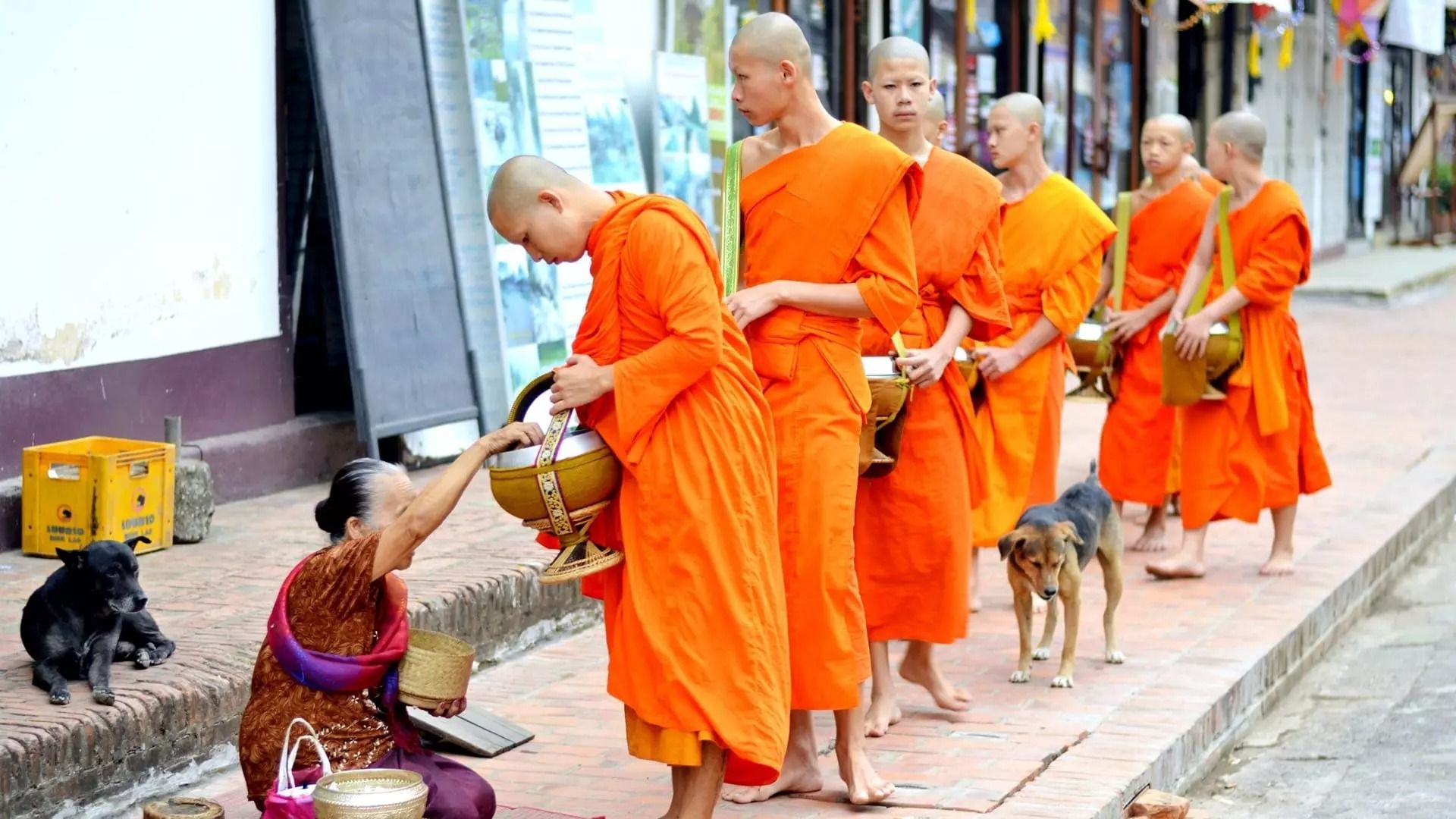 Green mountains of Laos ripple before me. It’s a hot and humid winter day. We’re in the ancient royal city of Luang Prabang. This morning at 6 am I witnessed a moving ritual. The village women get up well before 5 am to cook for the orange monks. During the day the monks’ chanting is heard all over town. Then at 6 am they come in long lines — the citizens (now aided by busloads of Korean tourists) fill their bowls with rice and other food for the day. This has nothing to do with begging. At least not in the way I feel it. The chanting of the monks is work. They fill the village with respect and peace; they set a hierarchy of honor as they weave the town in a web of meaning and community. It is not just the magnificent golden spires of the nimble temples that connect the community to the eternal laws of endless repetition, reaching deeply into what lies beyond our individual existence; it is the constant repetitions in humming monotone of the men and boys producing cosmic sound. Their concentrated efforts lighten my step and connect me to my vertical axis.